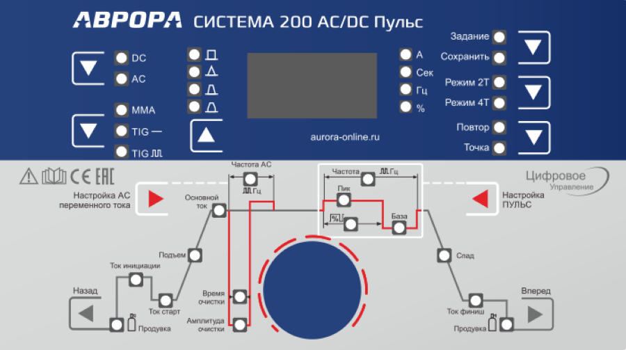 Аппарат TIG сварки Аврора Система 200 AC/DC ПУЛЬС - предназначен для профессиональной импульсной сварки постоянным и переменны током TIG AC/DC и для полноценной сварки штучным плавящимся электродом MMA. Имеются все необходимые настройки, с помощью которых можно добиваться самого высокого качества сварки алюминия, стали, нержавейки и любых цветных металлов. На удобной, понятной любому сварщику циклограмме отдельно настраивается режим ПУЛЬС и регулируется каждая стадия сварочного процесса для выполнения максимально широкого круга сварочных задач.