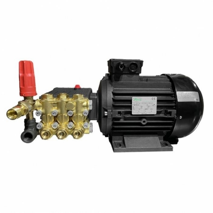 Насос модели ZA1520N развивает давление до 200 бар при расходе воды 15 л/мин. В качестве привода используется трёхфазный электродвигатель мощностью 5.5 кВт с частотой вращения 1450 об/мин. Система оснащена регулятором с перепускным клапаном (байпас), который обеспечивает внутреннюю рециркуляцию воды в случае превышения давления, защищая насос от перегрузок.