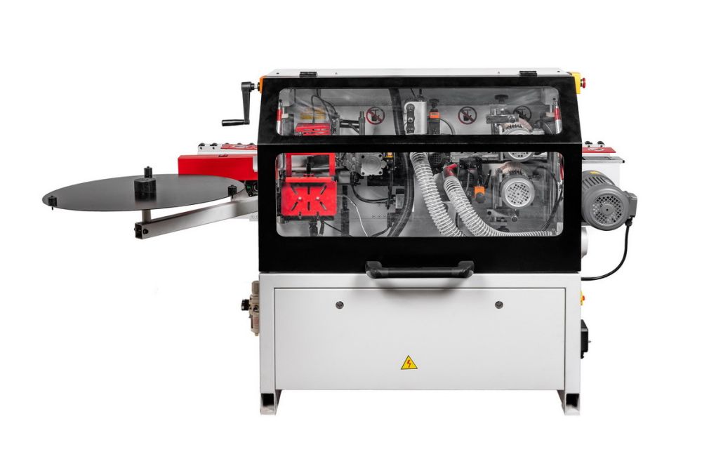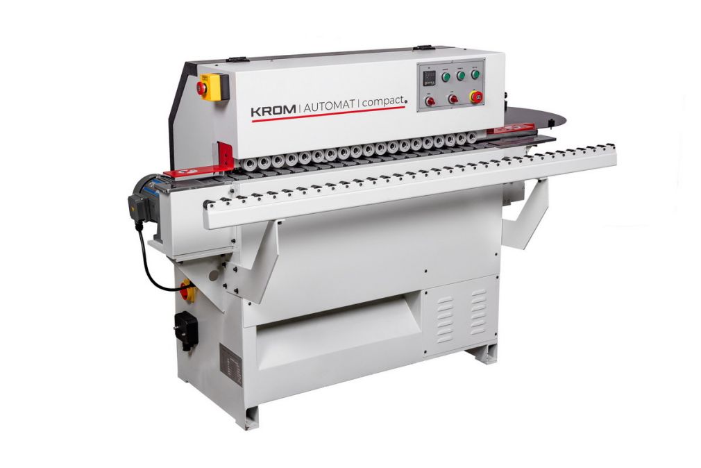 KROM AUTOMAT COMPACT - самый компактный автоматический кромкооблицовочный станок в нашем ассортименте. Станок приклеивает кромку, предварительно отрубая ее от бобины, фрезерует по длине (одновременно сверху и снизу) и полирует. В итоге деталь получается с приклеенной и обработанной кромкой, но требуется дополнительно обрезать выступающие хлястики кромки. В силу отсутствия торцевого узла станок работает очень тихо. Высокое качество комплектующих и сборки. Компактный размер позволит установить станок в относительно небольшом помещении. Станок хорошо держит настройки и легко перенастраивается.