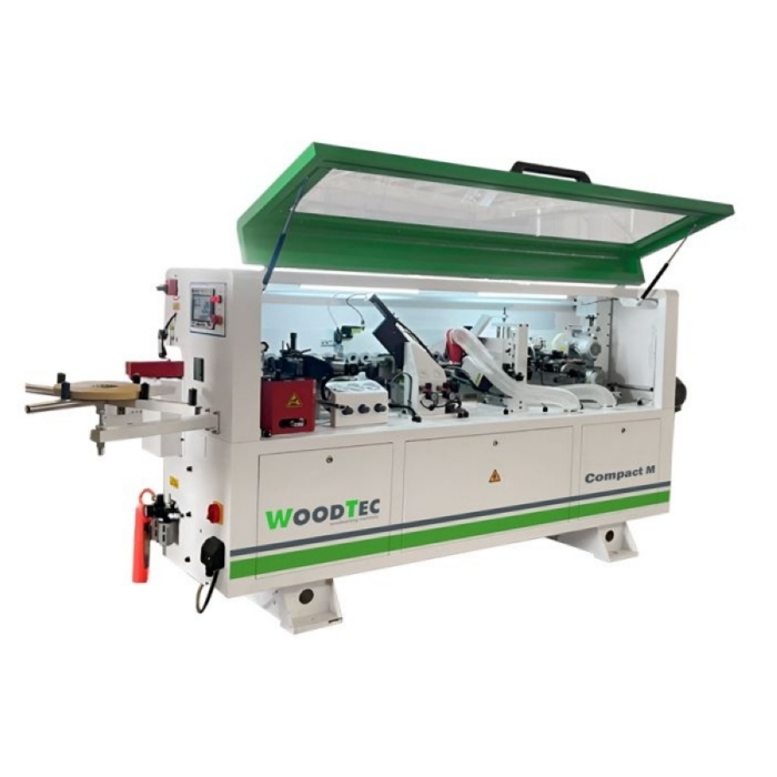 Автоматический кромкооблицовочный станок WoodTec Compact M — предназначен для облицовывания прямолинейных кромок плитных материалов рулонными кромками АБС, ПВХ и полосовым кромочным материалом толщиной до 3 мм.