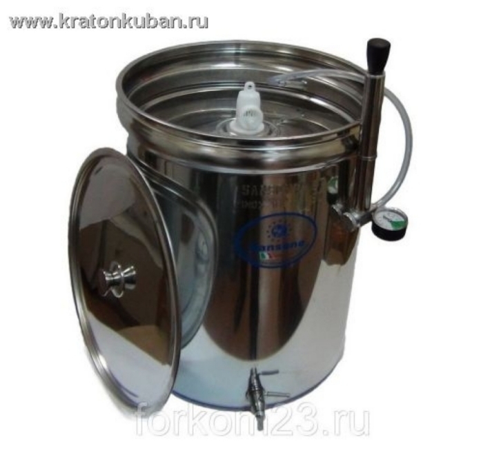 - Нержавеющий кран (1/2, 1 в зависимости от объема бочки) кран невероятно удобный и простой в своем использование, Вам всего лишь нужно выкрутить заглушку из нержавеющей стали и на ее место поставить кран. При сливе продукта через кран не забывайте опускать пневмокрышку ( плавающую крышку ) до уровня жидкости.