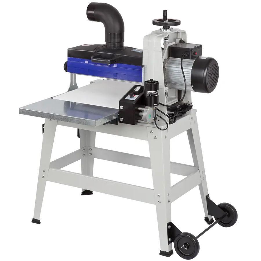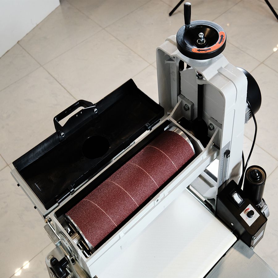 - Шлифовальный барабан имеет консольное расположение. При необходимости обработки более широких заготовок можно снять левую стойку и в два прохода обрабатывать детали шириной до 800 мм.