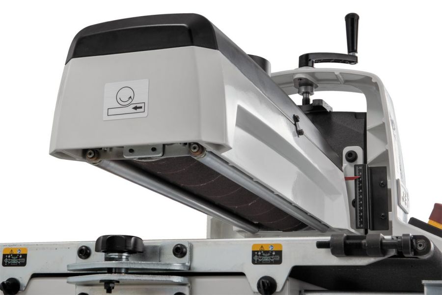 Расходным материалом служит абразивная лента, ее наматывают на барабан, концы фиксируют защелками, правильное натяжение обеспечивает специальное пружинное устройство, способное компенсировать растяжение материала при износе. Высоту расположения узла регулируют вращающейся рукояткой с одновременным контролем по миллиметровой шкале, для облегчения настройки можно приобрести устройство цифровой индикации и винтовой ограничительный упор. Регулировка параллельности расположения основания (отсутствие «клина») тоже производится без вспомогательных инструментов и приспособлений.