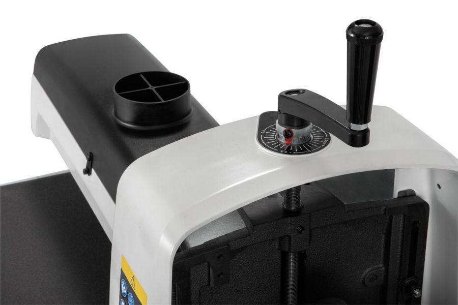 Расходным материалом служит абразивная лента, ее наматывают на барабан, концы фиксируют защелками, правильное натяжение обеспечивает специальное пружинное устройство, способное компенсировать растяжение материала при износе. Высоту расположения узла регулируют вращающейся рукояткой с одновременным контролем по миллиметровой шкале, для облегчения настройки предусмотрен регулируемый винтовой упор, так же можно приобрести устройство цифровой индикации. Регулировка параллельности расположения основания (отсутствие «клина») производится без вспомогательных инструментов и приспособлений.
