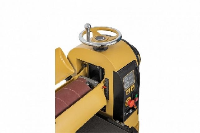 Для регулировки высоты положения шлифовального барабана предусмотрен массивный маховик с полированной поверхностью. Положение можно контролировать по привычной шкале на корпусе, но можно и по цифровому индикатору, так нагляднее и точнее. Он имеет переключатель режима отображения (дюймы/ миллиметры) и кнопку сброса для установки нулевого положения, что удобно как при смене толщины заготовок, так и при переходе к другой зернистости абразива. В качестве последнего используется лента шлифовальной бумаги, намотанная на алюминиевый барабан. Ее концы фиксируются в специальных зажимах, обеспечивающих простоту фиксации и автоматическое натяжение.