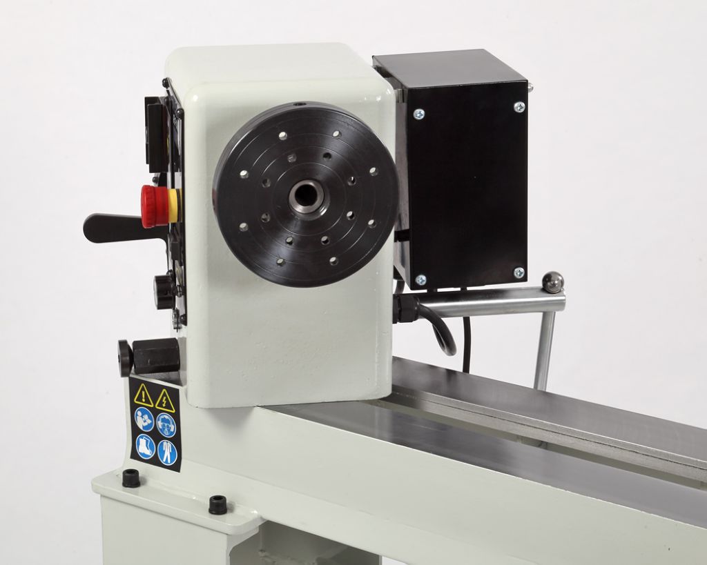 Заготовка получает вращение от шпинделя, скорость регулируется с помощью частотного преобразователя и имеет два диапазона: