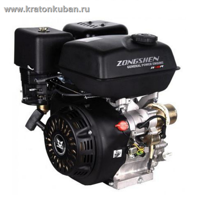 Бензиновый четырехтактный двигатель Zongshen 190FA2 имеет рабочий объем 420 куб. см. и мощность 15 л.с., систему газораспределения с верхним расположением клапанов OHV, принудительное воздушное охлаждение и горизонтальное расположение коленчатого вала диаметром 25,0 мм.