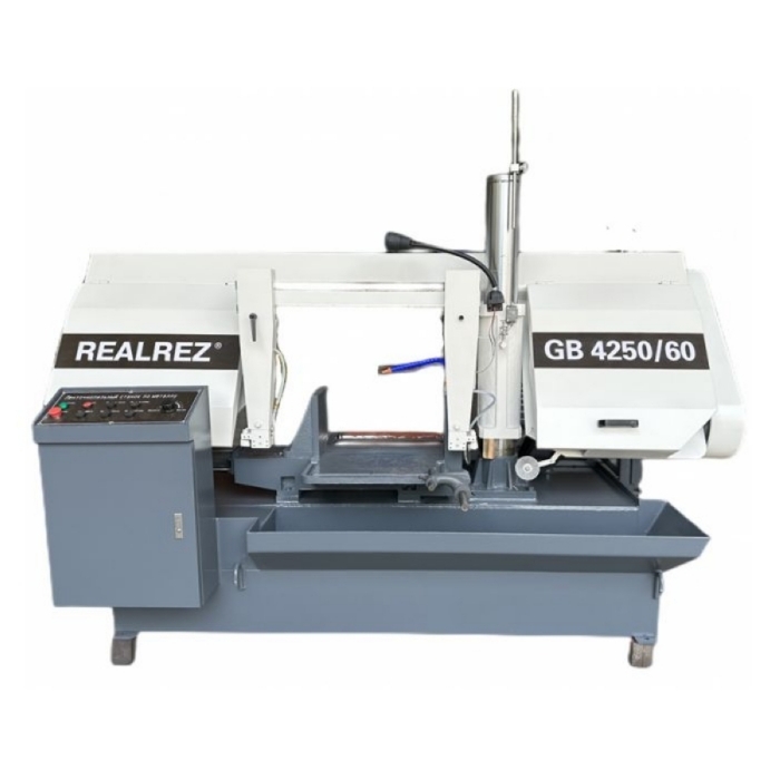 Ленточнопильный станок колонного типа GB4250/60 от REALREZ — это профессиональное решение для точного и стабильного пиления труб и сплошных металлических заготовок. Полуавтоматическая конструкция обеспечивает высокую производительность и удобство в работе, сочетая ручное и автоматическое управление в одном устройстве. Конструкция станка основана на двух массивных вертикальных колоннах, по которым перемещается прочная сварная пильная рама. Благодаря такому решению обеспечивается высокая жёсткость и точность пиления в условиях интенсивной эксплуатации. Модель GB4250/60 позволяет работать как в ручном, так и в полуавтоматическом режиме: станок выполняет полный цикл резания, включая подъем и опускание рамы, с исключением автоматической подачи материала. Технические особенности REALREZ GB4250/60: Комплектация:
