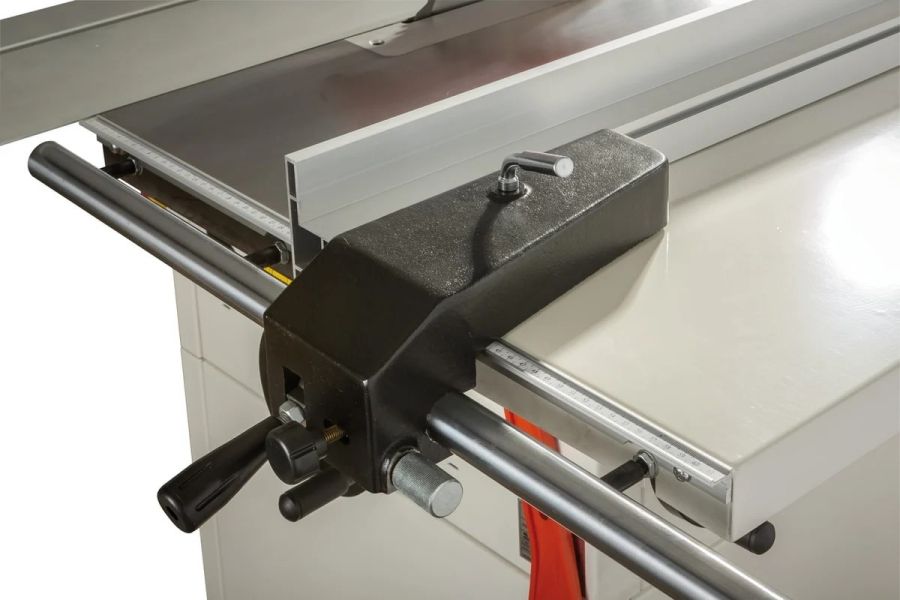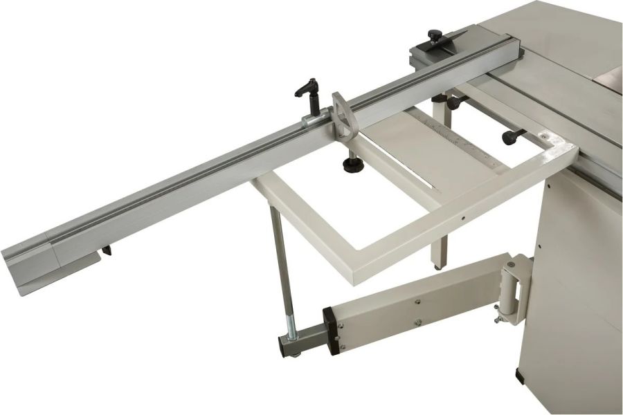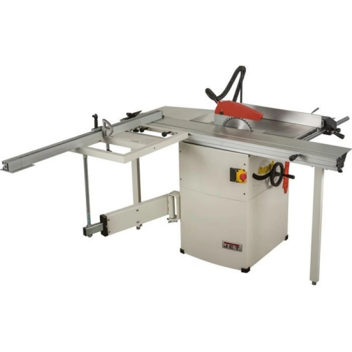 Циркулярная пила с кареткой Jet JTS-600XL – уникальный по сочетанию характеристик и стоимости станок. Уже в базовый комплект поставки входит подвижный стол (каретка) и расширение к нему. Расширитель укомплектован регулируемой телескопической опорой и торцевым упором заготовки. Торцевой упор выполнен поворотным, что позволяет делать распилы под точно установленным углом. Для фиксации заготовки можно использовать регулируемый концевой ограничитель; в случае ненадобности он откидывается.
