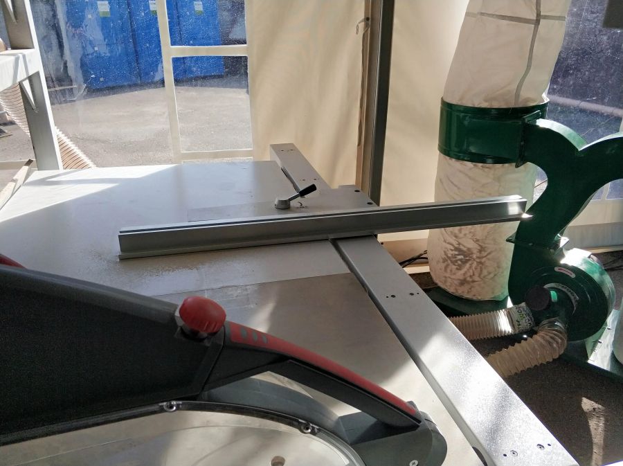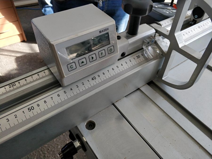 - Откидные упоры, расположенные на поперечной линейке с оптическими линзами, позволяют быстро и точно настроить станок на необходимый размер. При необходимости поперечный упор может быть развернут на угол от 0° до 45° для пиления под углом, отличным от прямого.