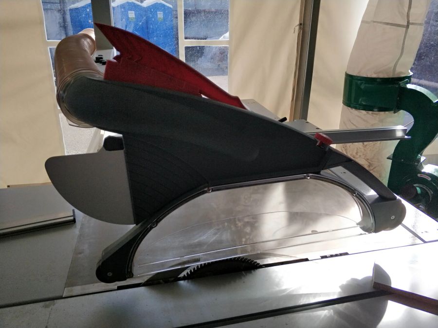 - Защитный кожух пилы с роликами качения по заготовке легко регулируется по высоте, обеспечивая качественное пылеудаление, а также защиту оператора. Такая конструкция позволяет исключить из раскроя расклинивающий нож без снятия защитного кожуха.