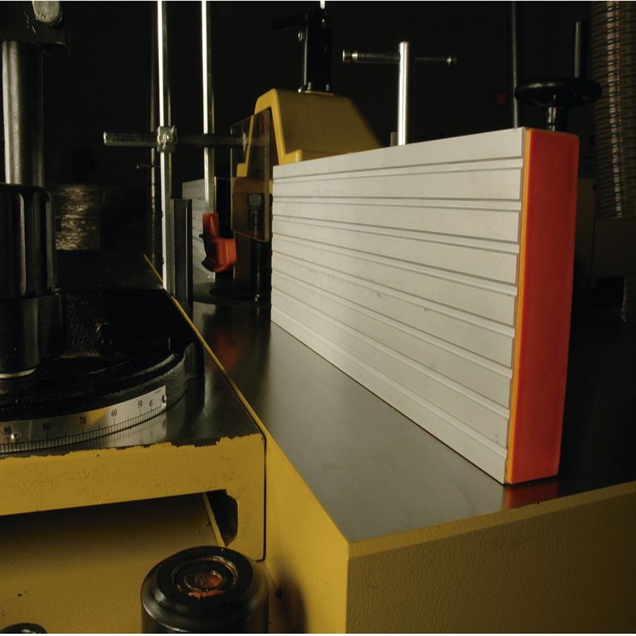 Каретка – массивный чугунный стол – перемещается по трем парам роликов. Они сориентированы так, чтобы наилучшим образом воспринимать давление, отжимающее заготовку. Такая конструкция полностью соответствует специфике работы станка и считается для фрезера оптимальной, поскольку обеспечивает высокую точность перемещения, которая не снижается в течение длительного срока эксплуатации станка. Для фиксации деталей на столе установлен регулируемый эксцентриковый прижим и длинный торцевой упор, который можно установить под любым углом к направлению движения.