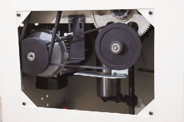 По основным характеристикам и удобству работы этот комбинированный станок не уступает отдельным рейсмусу и фуганку. Длинные и массивные чугунные столы создают базу, достаточную для работы с деталями длиной до 2-3 метров. Относительно специализированного станка несколько облегчен фуговальный упор: он не из чугуна, а из алюминиевого профиля. С другой стороны, эти модели обладают редким достоинством: удобную эксцентриковую регулировку по высоте имеет не только подающий, но и принимающий стол. Это необходимо, прежде всего, при замене строгального вала на helical, режущие пластины которого не регулируются по высоте.