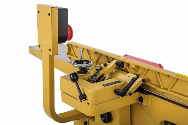 Столы установлены в пазах типа «ласточкин хвост» и имеют регулировку по высоте. Приемный перенастраивают в зависимости от типа строгального вала (helical или стандартный 3-ножевой). Положением подающего задают глубину строгания, регулировка сделана двухступенчатой. Основной эксцентриковый механизм оборудован рычагом и предназначен для быстрого изменения высоты в широких пределах. Вспомогательный (для тонкой настройки) винтовой – вращая набалдашник рычага, производят подстройку в небольшом диапазоне. Массивный чугунный упор заготовки оборудован механическим узлом регулировки. Угол наклона меняют вращением маховика с ручкой. Привод осуществляется через червячную передачу.