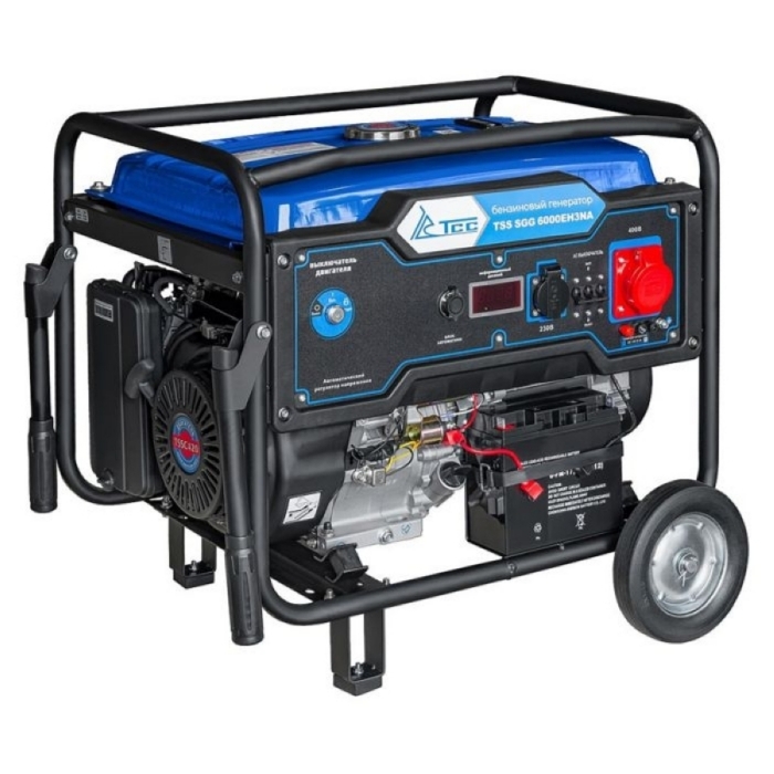 Генератор бензиновый ТСС SGG 6000EH3NA с электростартером и с разъемом для подключения блока автоматики. SGG 6000EH3NA при номинальной мощности равной 6,0 кВт, обеспечивает кратковременную пусковую мощность до 11 кВт. Необходимо учитывать, что схема соединения "Звезда" используемая в трехфазном бензогенераторе ТСС, позволяет, при подключении нагрузки к однофазному разъему 220В, получить полезную снимаемую мощность всего 2,0 кВт.
