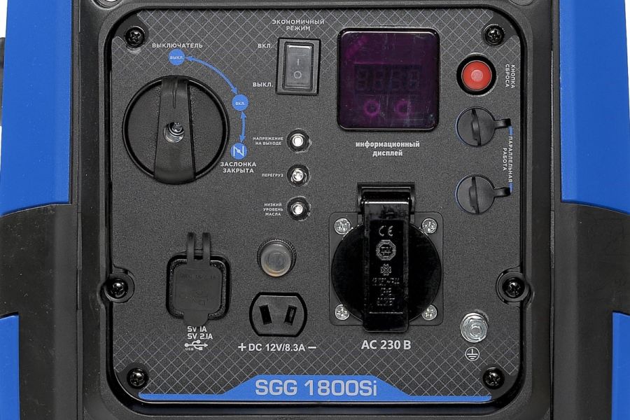 Индикаторы на панели показывают параметры напряжения, превышение мощности генератора, низкий уровень масла