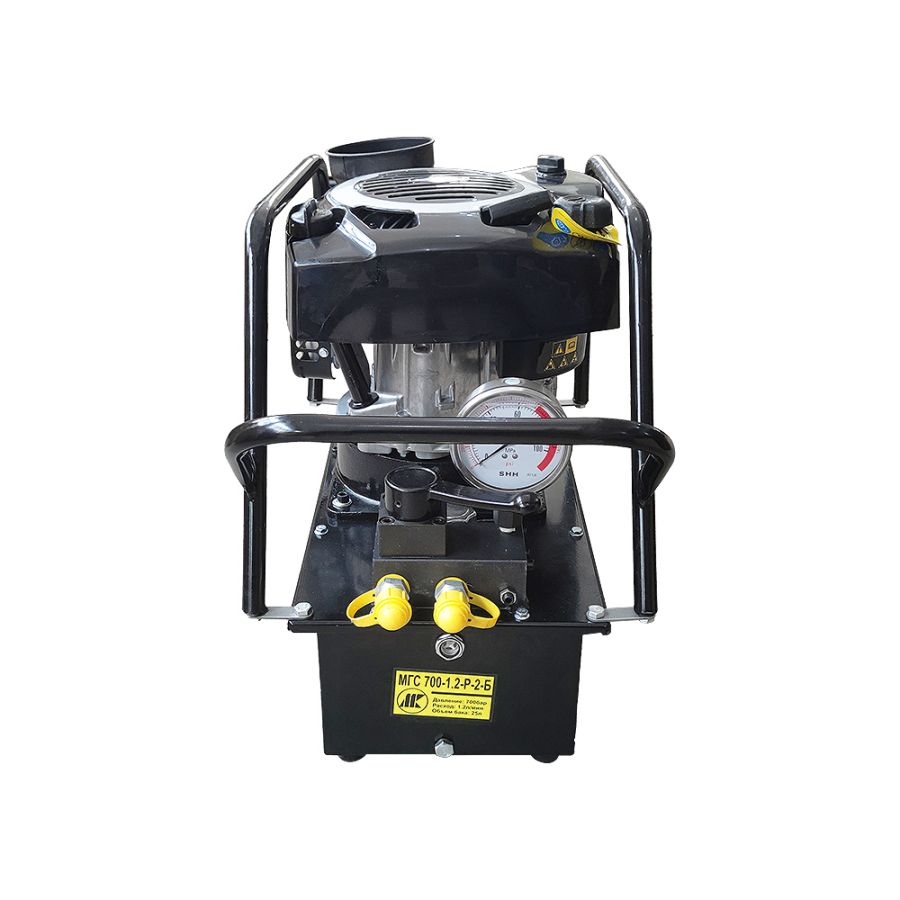 Маслостанция МГС 700-1.2-Р-2-Б оснащена ручным распределителем с подключенными к нему через быстроразъемные соединения рукавами высокого давления. На маслостанции установлен виброустойчивый глицеринонаполненный манометр со шкалой до 1000 бар. В качестве рабочей жидкости используется гидравлическое масло И-8А, ВМГЗ или масло с аналогичными характеристиками.