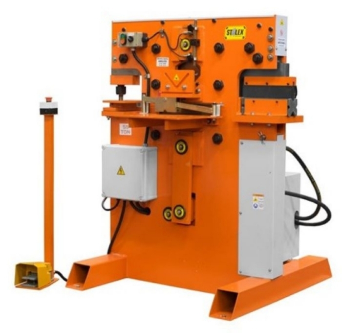 Станок металлообрабатывающий гидравлический Stalex M55 - является многофункциональными пресс-ножницами, предназначен для резки, гибки, пробивки отверстий в полосовой, профильной (круглое сечение), угловой стали. Широко применяется в машиностроении, на ремонтных заводах, строительных площадках и др. Станок может быть использован, как самостоятельная единица, так и в составе поточных автоматических линий. Дополнительно к станку можно приобрести широкий ассортимент дополнительных опций для обработки листовой, профильной (квадратное сечение) стали, прутка и труб. Усилие станка 55 тонн, станок оснащен выносной стойкой.