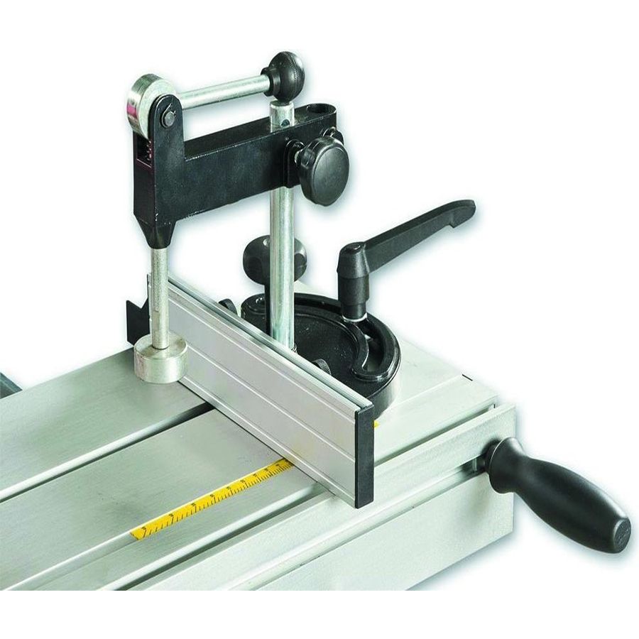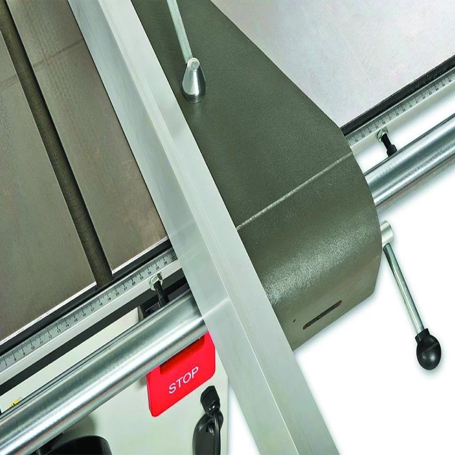 Станок оборудован подвижным столом (кареткой), ход которого составляет 1600 мм. При работе на нем деталь фиксируют при помощи углового упора, эксцентрикового прижима или продольного упора. В стандартный комплект входит и расширение подвижного стола с телескопической опорой и раздвижным поворотным упором заготовки. В разложенном состоянии его длина составляет 2200 мм, в сложенном 1200 мм.