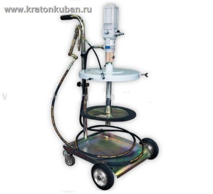 Мобильная установка для раздачи густых смазок в комплекте с тележкой, пневматическим насосом и маслораздаточным пистолетом.