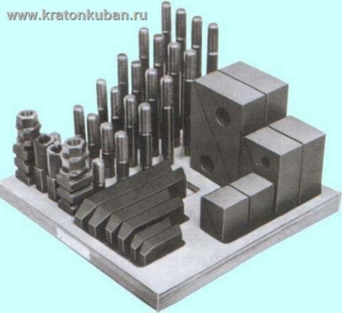 Комплект прихватов M-12 - предназначен для фиксации заготовок, деталей сложной формы при дальнейшей обработке на фрезерных, сверлильных и других станках , имеющих ширину паза 13.7-14 мм на столе. Для удобства работы набор располагается на открытой деревянной подставке.