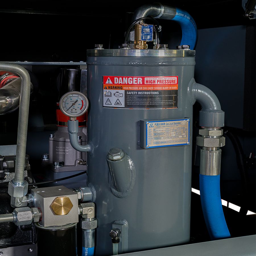 Постоянное сжатие воздуха не приводит к перегреву пневмоблока благодаря автоматическому масляному впрыску. От смазки энергоноситель очищается путем многоступенчатой сепарации.