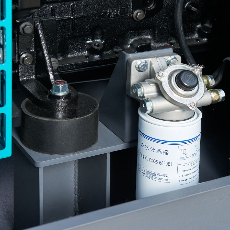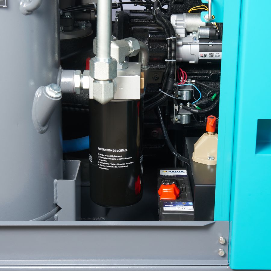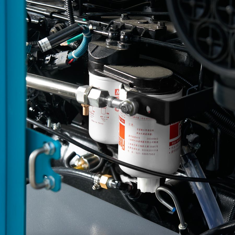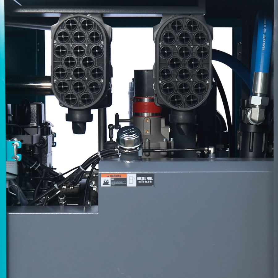 На дизельном компрессоре Master Blast MB устанавливается металлический топливный бак с металлической пробкой. Так же компрессор комплектуется двумя воздушными фильтрами (один для винтового блока, второй для дизельного двигателя) с циклонными входами. Такая конструкция позволяет предварительно очищать всасываемый воздух до попадания его на фильтрующий элемент.