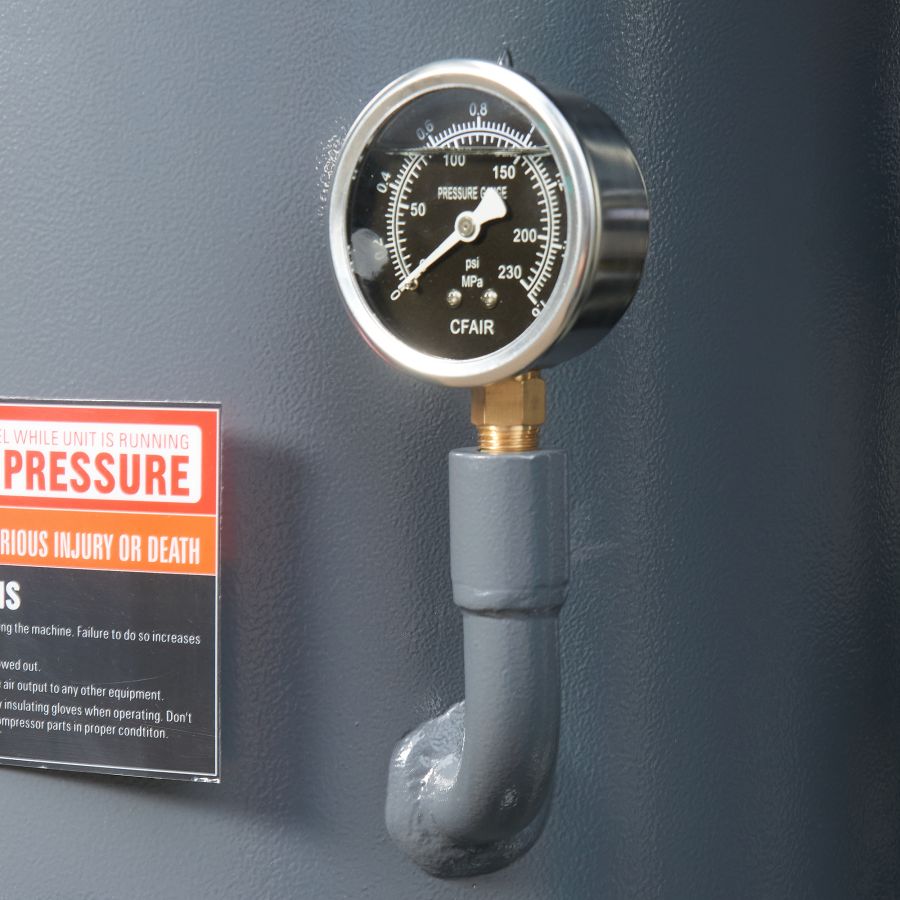 Панель управления закрывается дверцей с замком, на дверце находится прозрачное окно для визуального контроля состояния компрессора. Такое решение защищает панель приборов от попадания осадков, механических повреждений и от пыли. Ниже находится грибок аварийного останова компрессора и три выхода на 3/4 дюйма с внутренней резьбой.