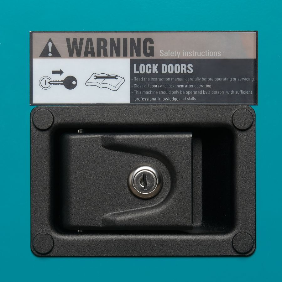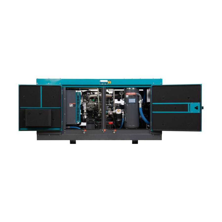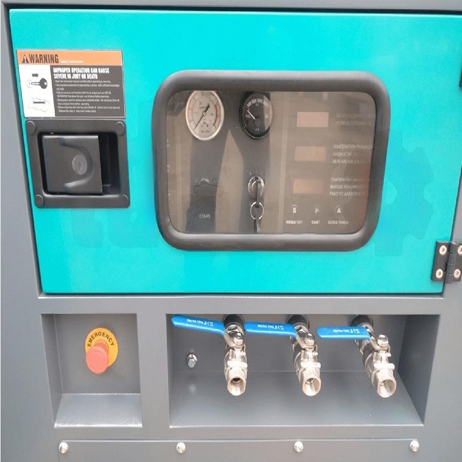 Панель управления закрывается дверцей с замком, на дверце находится прозрачное окно для визуального контроля состояния компрессора. Такое решение защищает панель приборов от попадания осадков, механических повреждений и от пыли. Ниже находится грибок аварийного останова компрессора и три выхода на 3/4 дюйма с внутренней резьбой.