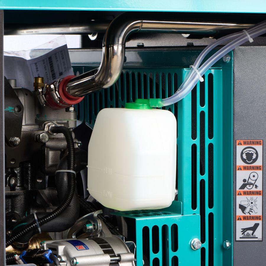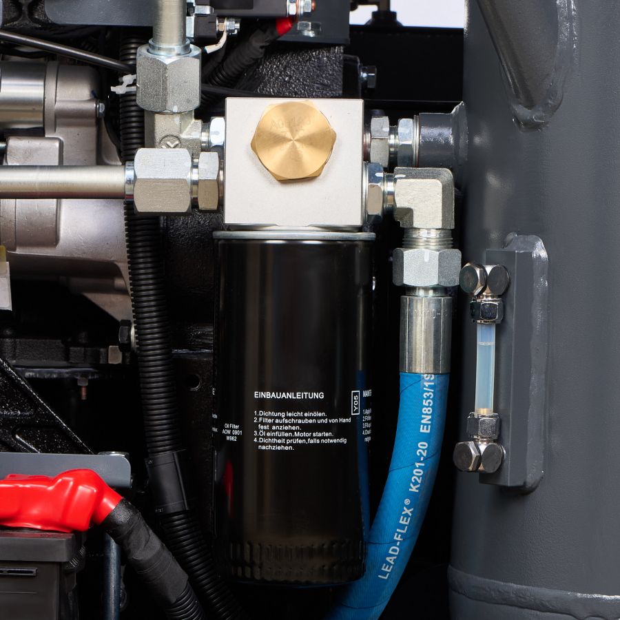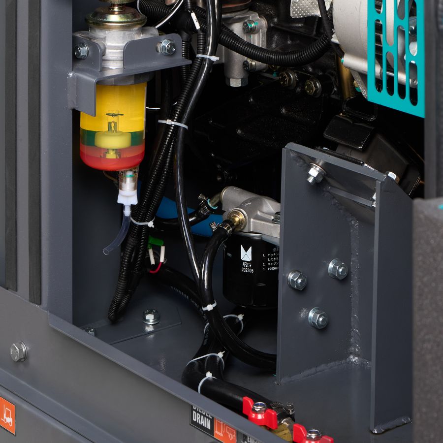 На дизельном компрессоре Master Blast MB устанавливается металлический топливный бак с металлической пробкой. Так же компрессор комплектуется двумя воздушными фильтрами (один для винтового блока, второй для дизельного двигателя) с циклонными входами. Такая конструкция позволяет предварительно очищать всасываемый воздух до попадания его на фильтрующий элемент.