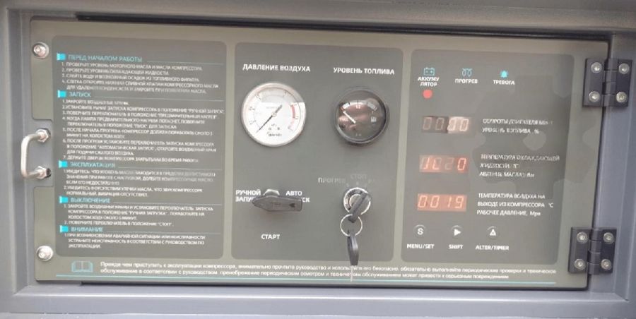 На панели управления находятся механический манометр, указатель уровня топлива в баке, ключ запуска компрессора. Так же имеются контрольные лампы зарядки аккумулятора, включения свечей накала и сигнал тревоги. Ниже находятся цифровые индикаторы температуры охлаждающей жидкости, температуры воздуха на выходе из компрессора и обороты двигателя.