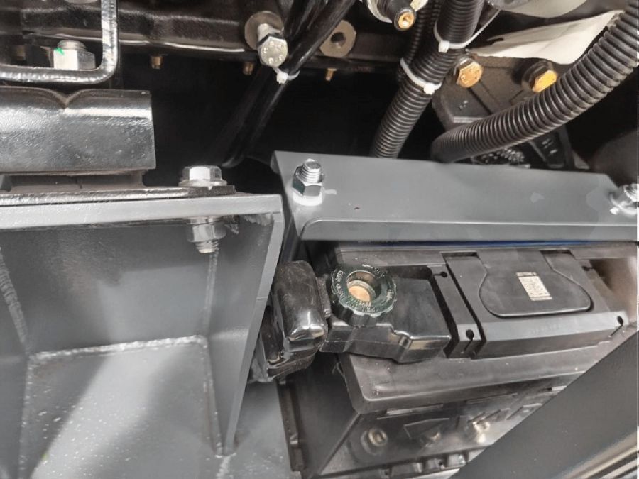 Аккумулятор жестко закреплен мощной скобой. Такое крепление не даст разболтаться аккумулятору, что может привести к возгоранию компрессора. Так же на минусовой клейме аккумулятора есть разрыватель массы, им удобно пользоваться при длительном простое дизельного компрессора.