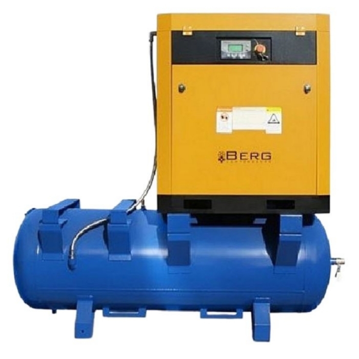 Компрессор винтовой на ресивере Berg ВК-11Р-500 – популярная компрессорная установка компании Berg. В этой модели мощностью в 11 кВт применяется простая и неприхотливая в работе ременная передача, а поддерживаемое установкой давление в воздушной сети составит на выбор пользователя 7, 8, 10 bar, в зависимости от передаточного отношения ременной передачи с электродвигателя на винтовую пару и настроек контроллера.