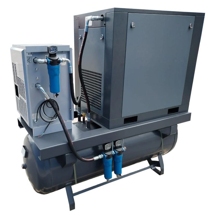Версия с ресивером (500 л.), рефрижераторным осушителем, комплексной магистральной фильтрацией. Готовое решение для производства сухого и качественного сжатого воздуха. Осушитель с точкой росы +3°C обеспечивает высокоэффективное удаление влаги и выведение конденсата через сливной клапан. Фильтрующие элементы дополнительно очищают воздушный поток от твердых включений и парообразных масляных частиц.