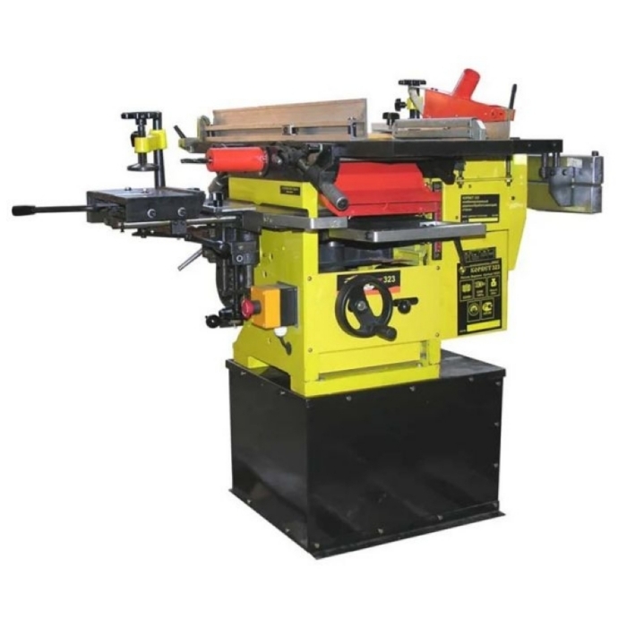 Универсальный деревообрабатывающий станок Корвет 323 - предназначен для обработки заготовок из дерева и его производных: строгания по направляющей планке (строгальный станок), строгание по толщине в размер (рейсмусовый станок), продольного и поперечного пиления (пильный станок), выполнения рада сверлильно-фрезерных операций.