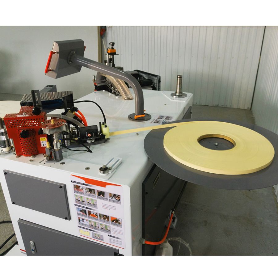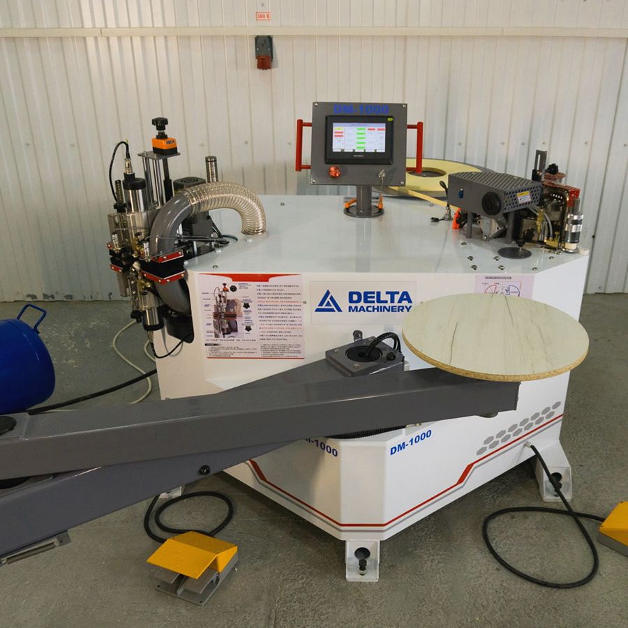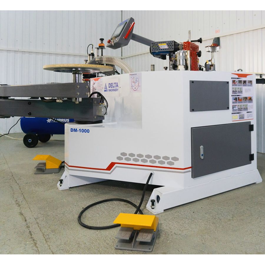Кромкооблицовочный станок с подвижной вакуумной консолью DELTAMACHINERY DM-1000 – его главная особеннсть - это подвижная вакуумная консоль, которая позволяет без труда в одиночку приклеивать кромочный материал на крупногабаритные криволинейные и прямолинейные детали. Станок оснащен клеевой ванной с нижним расположением клеевого бачка объемом 2000 мл., с установленным промышленным феном и возможностью регулировки температуры подаваемого на кромку воздуха. Для получения максимально качественного результата приклеивания кромки станок оборудован форсунками для подачи разделительной жидкости в зону контакта плоскости заготовки и свеса кромки. Количество подаваемого кромочного материала в мм осуществляется с помощью инкодера. Для работы с крупногабаритными криволинейными заготовками, оклеиваемыми по замкнутому контуру, станок оснащен оптическим датчиком определения края кромки (лазером). Двухсторонний фрезерный узел для снятия свесов оснащен высокооборотистыми моторами 24 000 об/мин., мощностью 800 Вт каждый. Фрезер оборудован копирами с микронастройкой по плоскости и приводным копиром с изменяемой скоростью подачи по торцу заготовки. Для получения высококачественной обработки свеса кромки сразу за фрезами располагаются управляемые пневматикой плоские цикли. В зону обработки нижней и верхней фрезы возможна подача разделительной жидкости с помощью форсунок расположенных на фрезерном узле. Управление станком осуществляется с помощью промышленного сенсорного контроллера IT7000.
