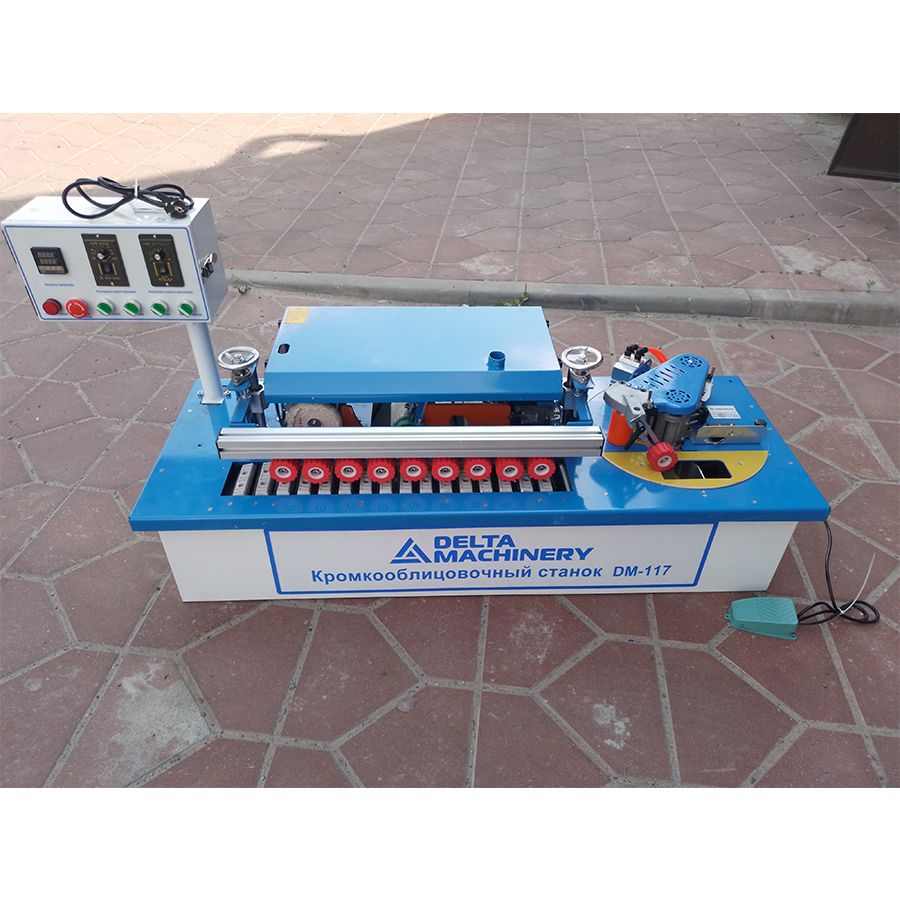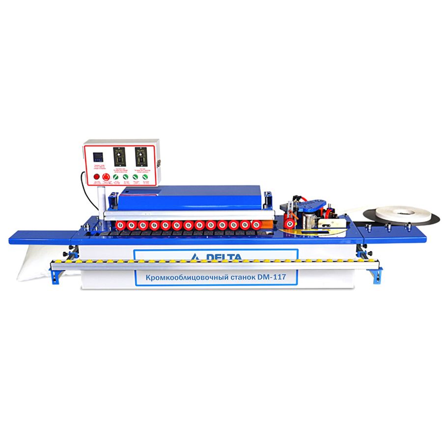 Кромкооблицовочный станок c автоматической подачей заготовки DELTAMACHINERY DM-117 — предназначен для облицовывания прямолинейных мебельных щитов и заготовок натуральным полосовым и синтетическим рулонным материалом. А также для снятия свесов (фрезерования) уже приклеенного кромочного материала одновременно как с нижней, так и с верхней части детали. А также чистовой торцовки.