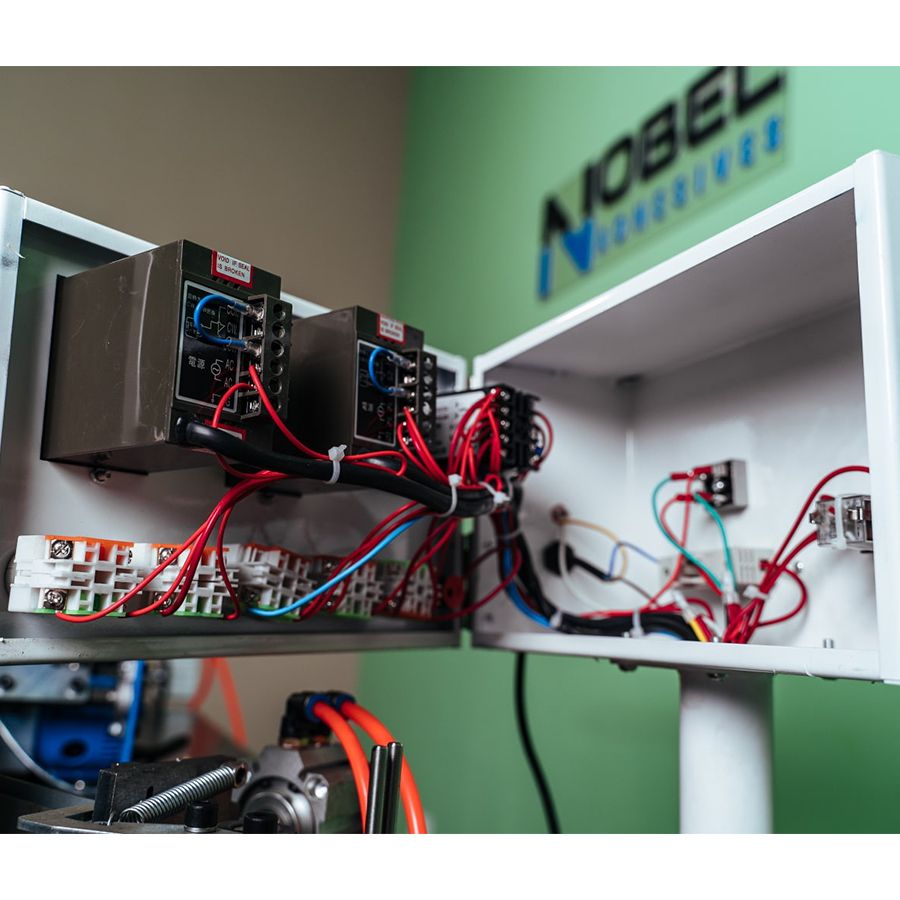 Фрезерный узел с высокооборотистыми фрезами, производит снятие свесов кромки сверху и снизу заготовки за один проход. Регулировки температуры клеевой ванны и скорости вращения роликов и подачи кромки расположены на центральной панели управления.
