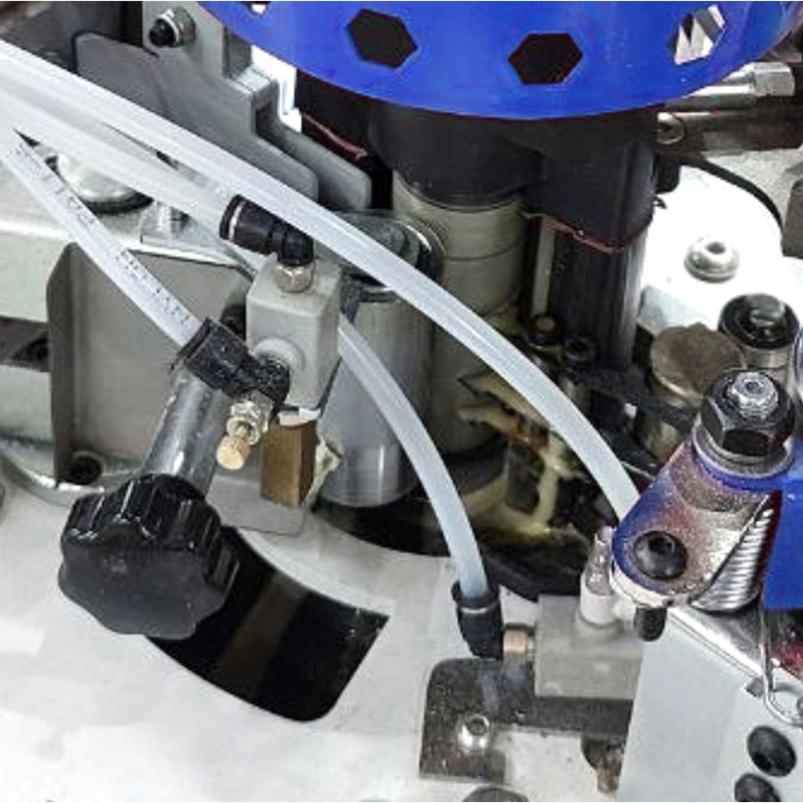 Для получения максимально качественного результата приклеивания кромки станок оборудован форсунками для подачи разделительной жидкости в зону контакта плоскости заготовки и свеса кромки.