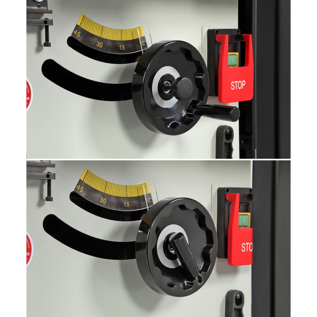 - Высота пропила под углом 90° - 80 мм, 45° - 55 мм. Регулировка угла наклона и высоты пильного диска с помощью маховиков на корпусе станка.