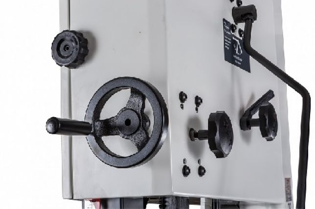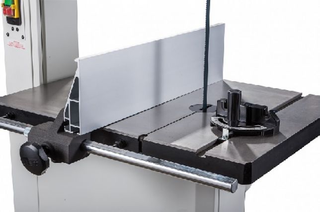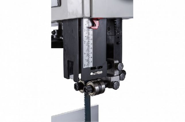 Ленточная пила Jet JWBS-18-T – её основное преимущество на фоне аналогов прошлых поколений – увеличенная высота распиловки. Этот параметр очень важен для тех, кому нужен универсальный станок, способный взять на себя функции делительного. К подобным работам приспособлен и параллельный упор: направляющий профиль можно установить вертикально на боковую грань так, чтобы надежно фиксировать плоские заготовки при их роспуске на тонкие пластины. В целом конструкция бокового упора очень хорошо проработана и соответствует самым строгим требованиям: профиль жесткий и прочный, закреплен на массивном чугунном кронштейне, который перемещается по цилиндрической направляющей. Предусмотрена грубая (вручную) и точная (микрометрическим винтом) установка.