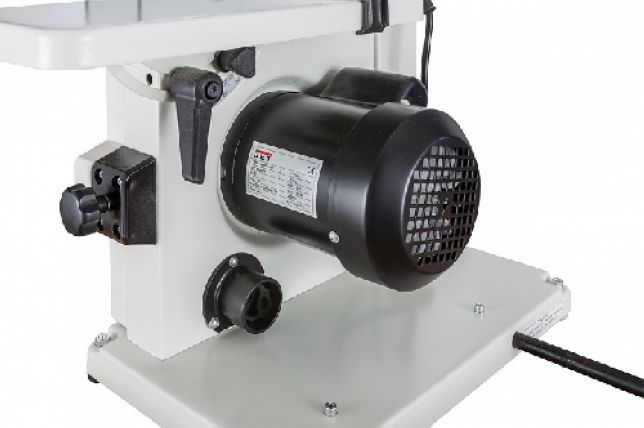 Ленточная пила Jet JWBS-8-M – компактный ленточнопильный станок для хобби и эпизодических работ по дому, гаражу или хозяйству. Его устройство очень рационально, что позволило реализовать все стандартные функции ленточной пилы, не усложняя конструкцию. Ведущий шкив диаметром 210 мм установлен прямо на вал двигателя: он делает 1420 оборотов в минуту и понижающий редуктор не требуется. Направляющие полотна изготовлены в виде цилиндрических штифтов, которые удерживают ленту своими торцами. По мере износа или при замене ленты их регулируют, сдвигая вдоль оси и зажимая винтами с шестигранником. Продольную опору обеспечивает ролик с шарикоподшипником. Весь верхний узел опускается и поднимается в зависимости от толщины заготовки; аналогично устроенный нижний узел неподвижно закреплен под рабочим столом.