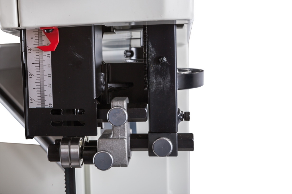 Механизм натяжения ленты две трехроликовых направляющих на шарикоподшипниках, стрелочный индикатор уровня натяжения, регулирующие маховики, два смотровых окошка и рычаг быстрого натяжения-ослабления. Рычаг три фиксированных положения: рабочее (плотно натянуто), для хранения (лента ослаблена, но держится на шкивах) и сервисное (для замены полотна). Чтобы улучшить плавность работы, использованы чугунные шкивы с массивным телом, а не в виде спицованных колес, как раньше.