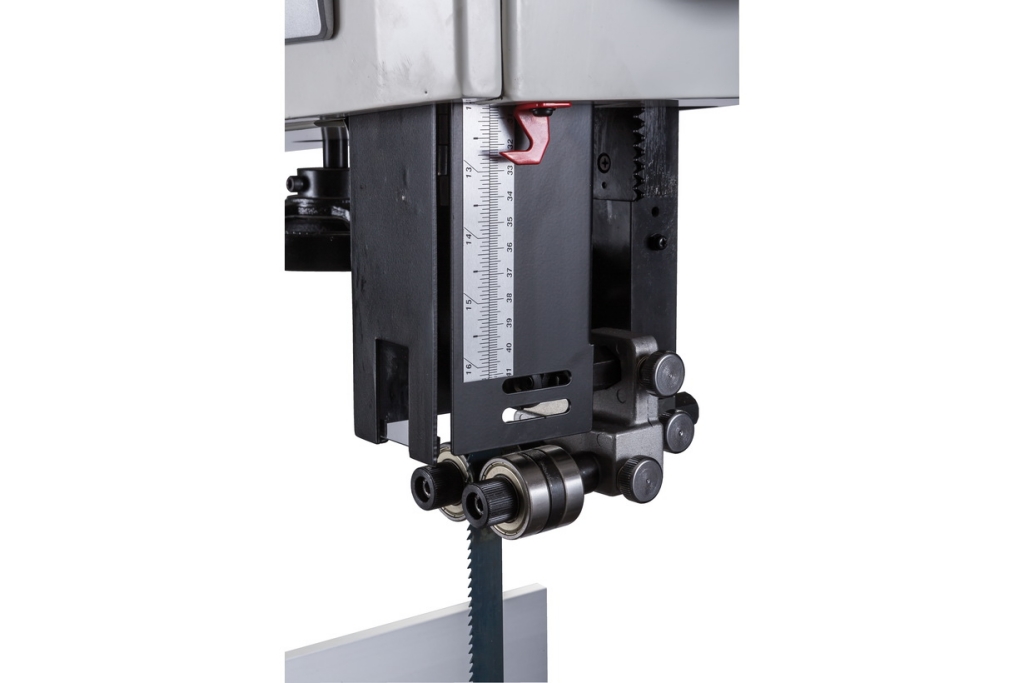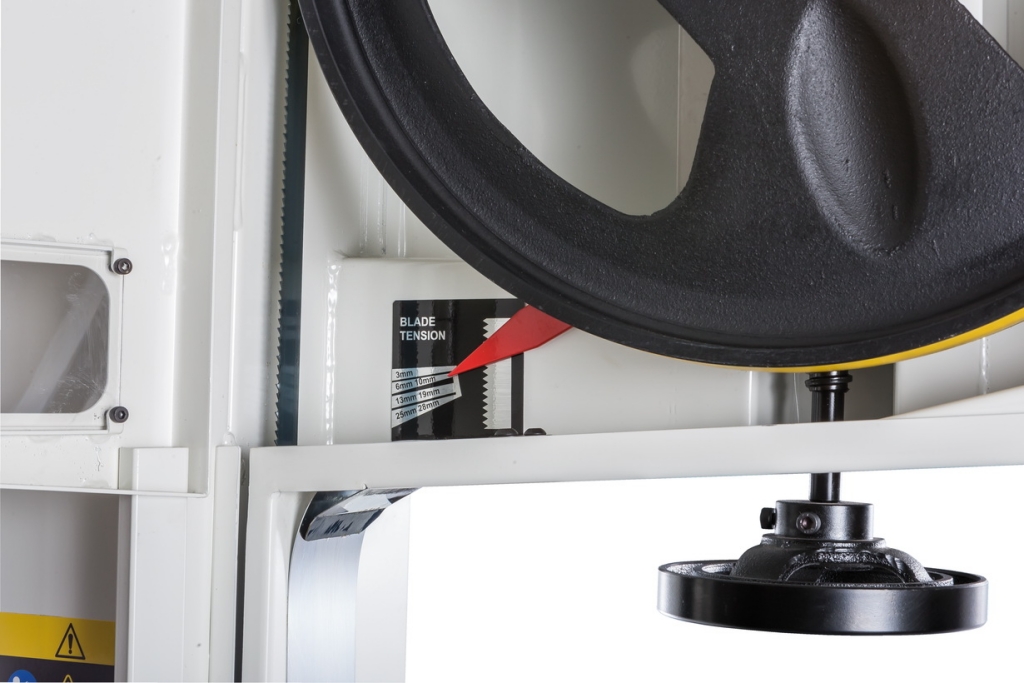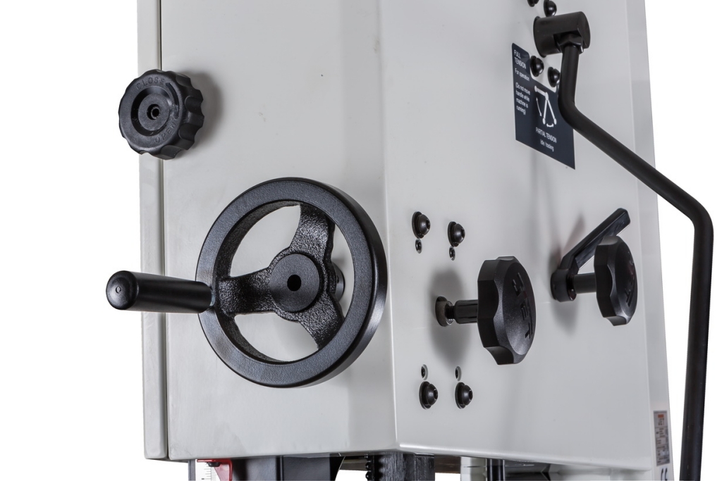 Механизм натяжения ленты две трехроликовых направляющих на шарикоподшипниках, стрелочный индикатор уровня натяжения, регулирующие маховики, два смотровых окошка и рычаг быстрого натяжения-ослабления. Рычаг три фиксированных положения: рабочее (плотно натянуто), для хранения (лента ослаблена, но держится на шкивах) и сервисное (для замены полотна). Чтобы улучшить плавность работы, использованы чугунные шкивы с массивным телом, а не в виде спицованных колес, как раньше.