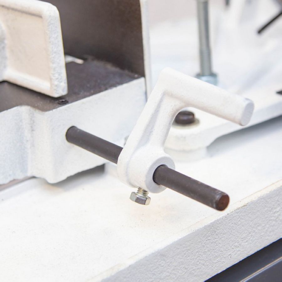 - Зажим заготовки осуществляется тисками вручную, за счет вращения маховика, подача заготовки - также вручную