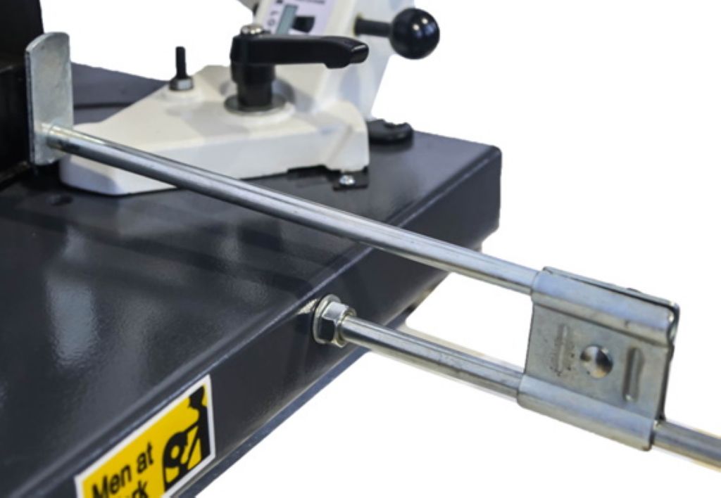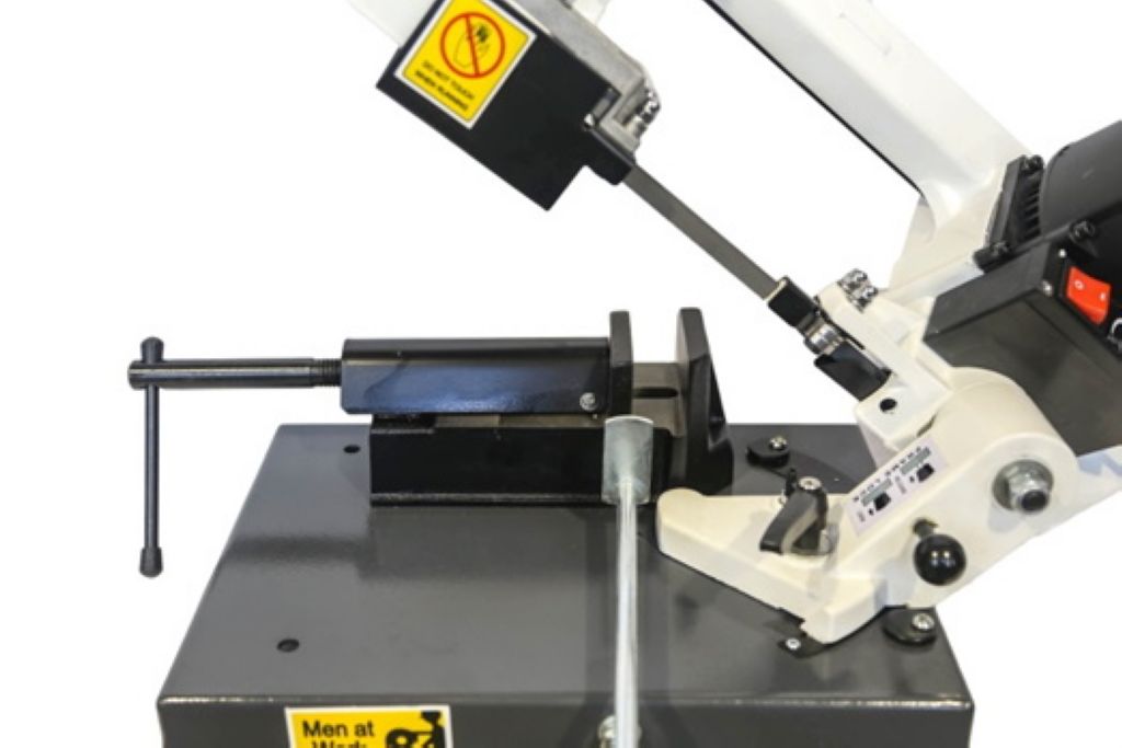 - Данная модель оснащена стационарными тисками, для резки под углом, поворачивается рама, а не заготовка. Зажим заготовки осуществляется тисками вручную, подача заготовки - также вручную.