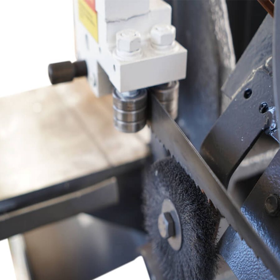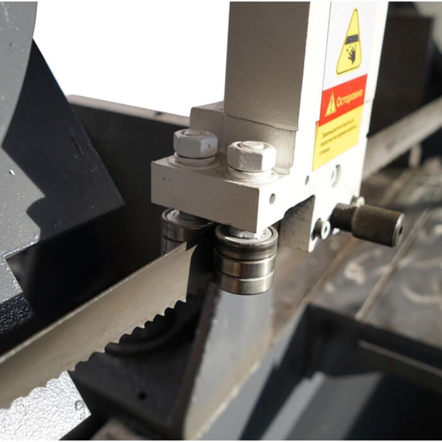 - Перпендикулярность полотна обеспечивается за счет направляющих, в которые установлены по шесть подшипников. Вылет направляющих можно изменять под размеры заготовки.
