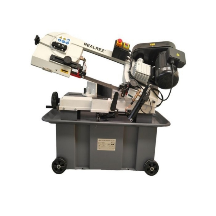 Ленточнопильный станок REALREZ c оптимальным диапазоном резки предназначена для профессиональных мастеров. Отличается производительностью и простотой в использовании. Рама станка имеет поворотный механизм, что является большим плюсом при резке металла под углом. Несмотря на небольшие размеры и вес станок стабилен, не вибрирует при резки даже больших материалов. Станок автоматически останавливается после окончания резки. Станок оборудован системой СОЖ.
