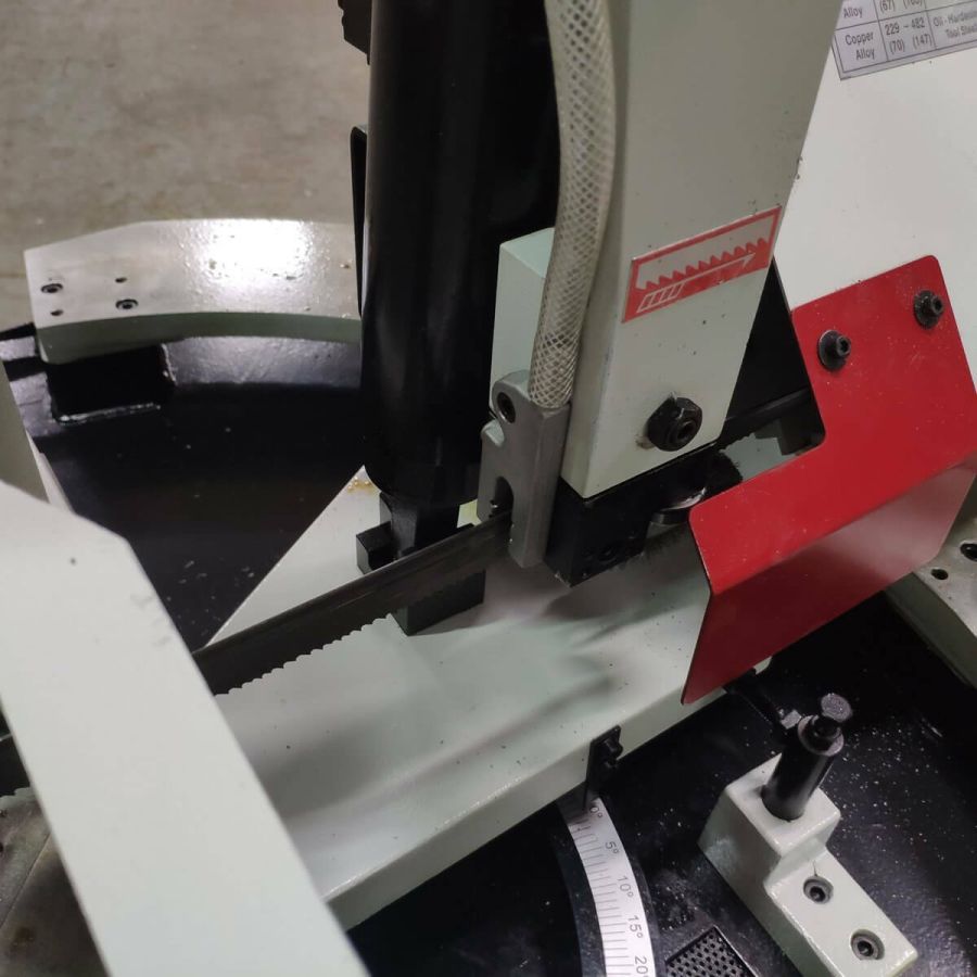 В рабочей зоне резания полотно точно ведется двумя направляющими головками. Станок имеет неподвижные тиски и поворотный механизм рамы, для пиления под углом необходимо изменить положение рамы относительно неподвижных тисков. Высота полотна 27мм позволяет пилить c высокой точностью и параллельностью полые и профильные заготовки под различными углами, в том числе и сплошные заготовки.