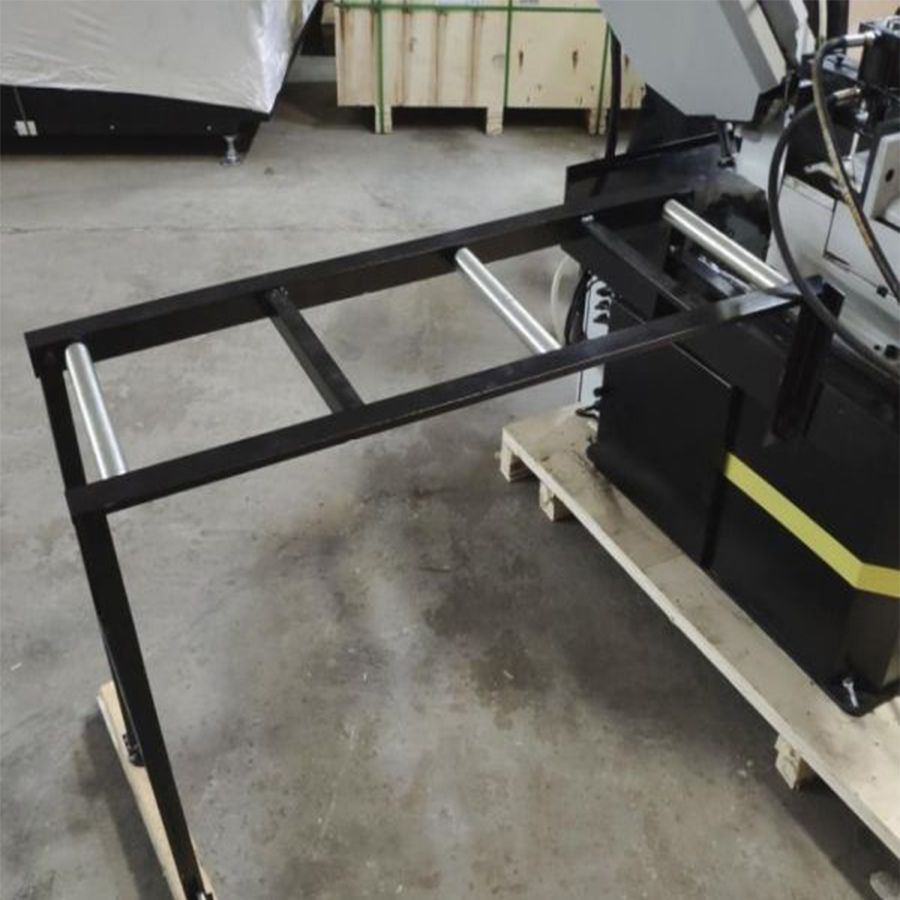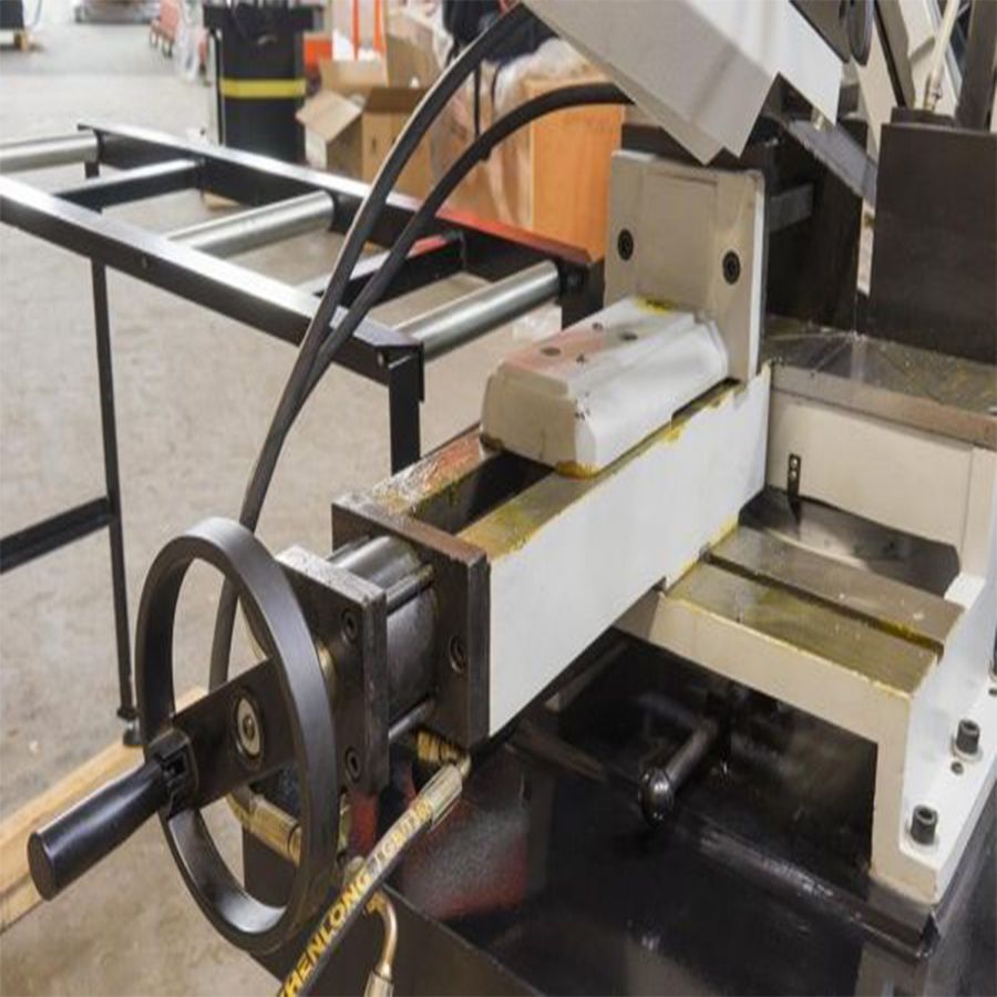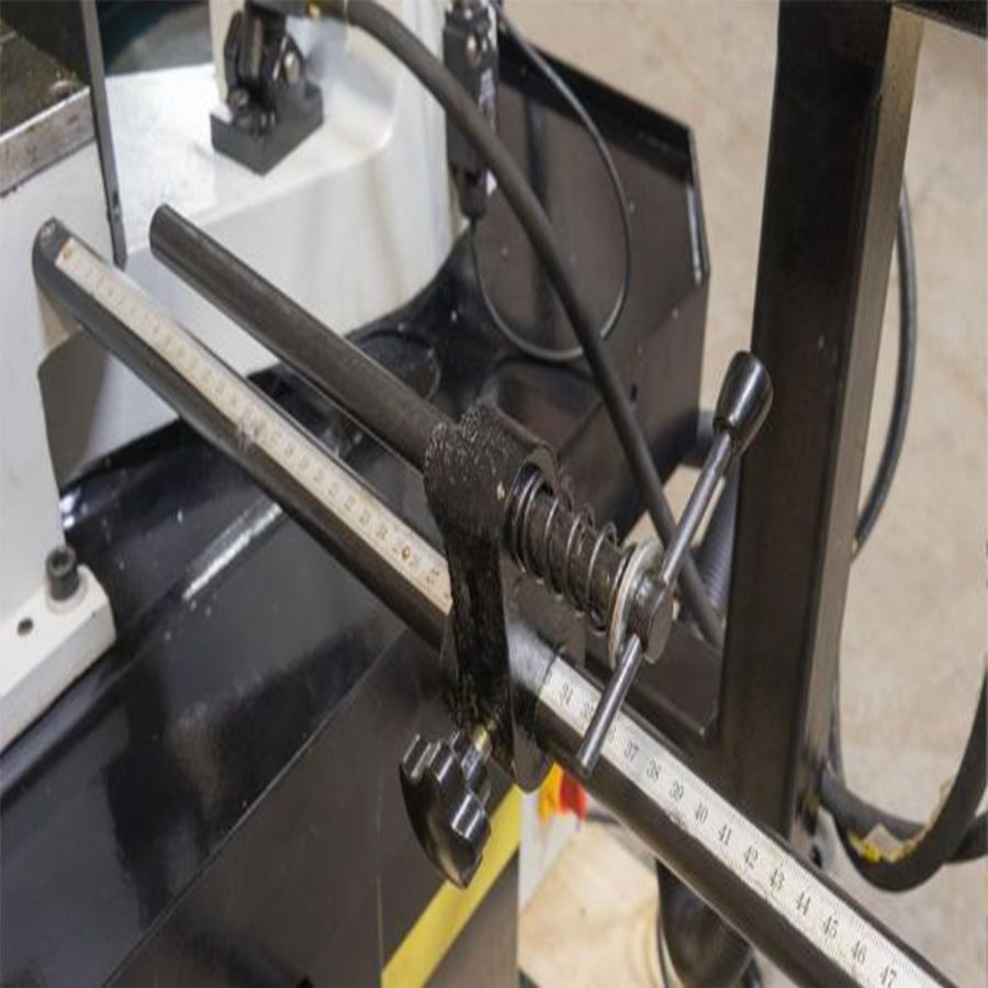 В рабочей зоне резания полотно точно ведется двумя направляющими головками. Станок с возможностью поворота корпуса пилы от -45° 0° до +60°, предназначен для пиления заготовок, под различными углами и при частой смене угла пила (т.е. поворота рамы пилы по градусной линейке относительно неподвижных тисков).